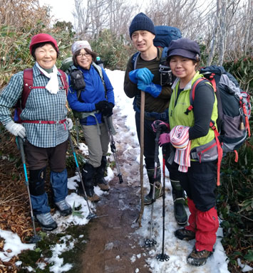 雨を懸念していたけれど、当分降らないような気がしていた。中間点となる烏帽子林道には、一台の車が停まっていた。こんな日にやっぱり登る人がいるもんだと思っていたが、その先を進み雪が現れた頃に、一人の女性が降りて来られた。ちょっぴりお話をすると、ショッチュウ登っておられるとの事、そして、お話が進むに連れ、私の名を知っておられる事に感激をしてしまい、一緒にカメラに収まってもらった。