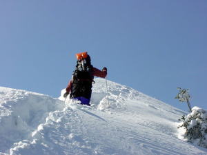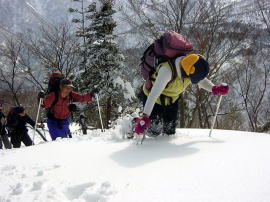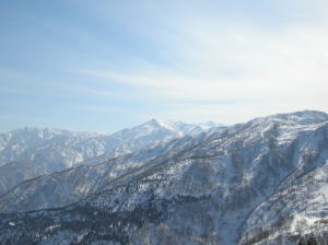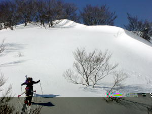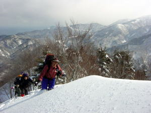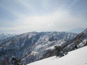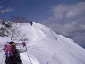 今日は、人間ラッセル車の長勢君が、一手にラッセルを引く受けてくれ、「好山病友の会」のメンバーをどんどん引っ張ってくれたのである。その勢いでは、大鷲山の山頂から大きな鞍部を越え、焼山・黒菱山に届くのではないかと思う程であった。