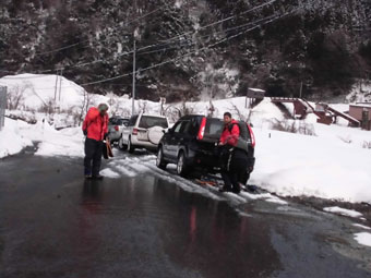 すぐに、スノーシューを装着した。 |