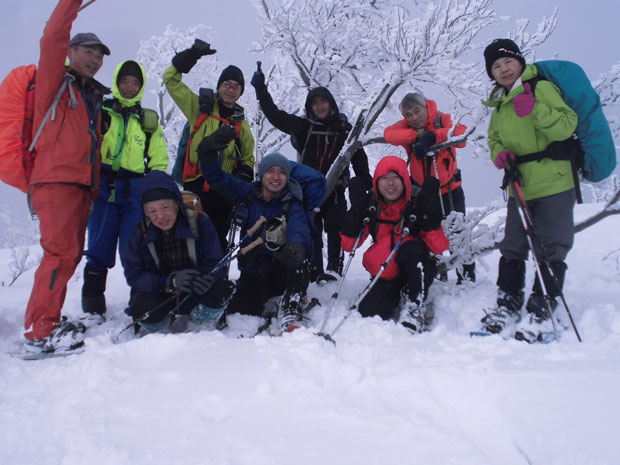 悪天が予想された、その大鷲山に9名の強者達が集まった。(イヤ、私達夫婦は除外しなければいけないが・・)行ってみれば意外と少ない積雪に驚いたが、少し高度を上げれば、そのような事は忘れてしまう程であった。叩き付けるような風雪に身を縮めるような時もあったが、「わ~っ、海が・・」 「焼山・黒菱山が・・」 などと、歓声を上げさせてくれる時もあった。