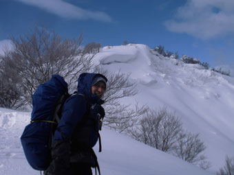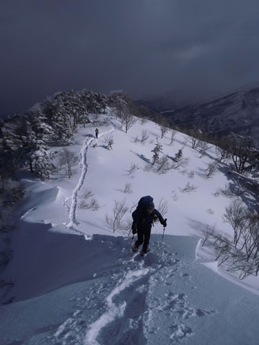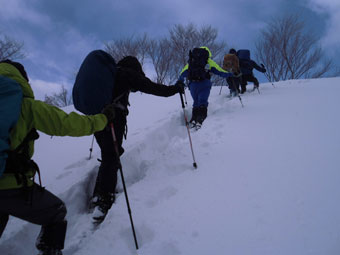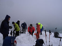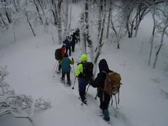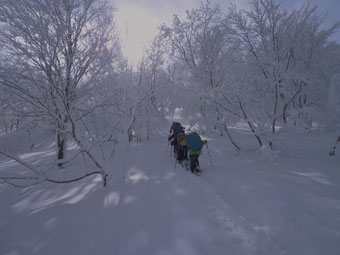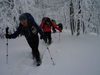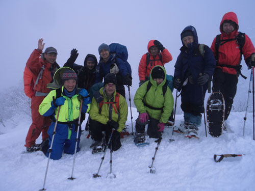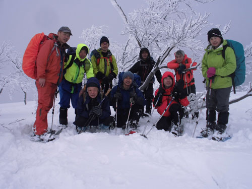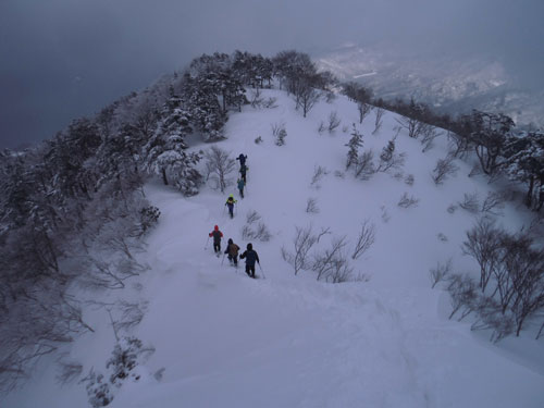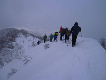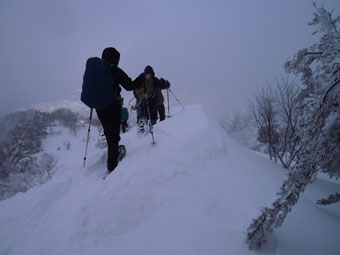 一番のポイントである雪庇の張り出した所や、細尾根の所だけは陽が差し、皆がカメラを構えていた。強者達の勢揃いだっただけに、「ラッセルの順番が回ってこない。」 との不満があったかもしれないが、低山でありながら、真冬の厳しい寒さの体験で、ご破算になったような気がする。