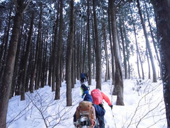| 神社横の杉林急斜面に取り付く。 |