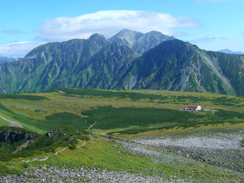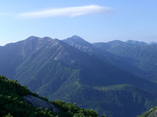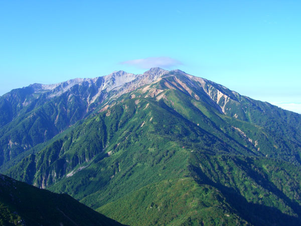 | 中央尾根の真ん中が、スゴ乗越小屋。スゴ乗越はずっと下部に・・・ 後方は薬師岳。雲下は北薬師岳。 |