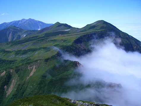 | 青空の下、越中沢岳へ・・・ | 左手前がスゴノ頭 | 越中沢岳 |