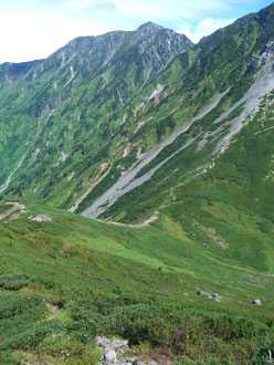 | 五色ヶ原と離れてザラ峠へ・・・ 後方は鳶岳 |