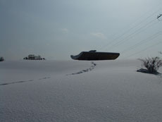 御前山周辺に来ると、トレースが少し埋も れていた。しかし、トレースには従わなか った。 しかし、斜面では腰まで浸かった。 |