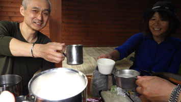 あれもこれも話ししたいと思っていたが、出て来る食材に気を取られてか、充分に話せたかは分からない。でも、楽しかったの一言に尽きる。パンパンになったお腹を抱えて小屋を出る。山頂広場で記念写真を撮るが家に戻って見ると具合が悪かった。