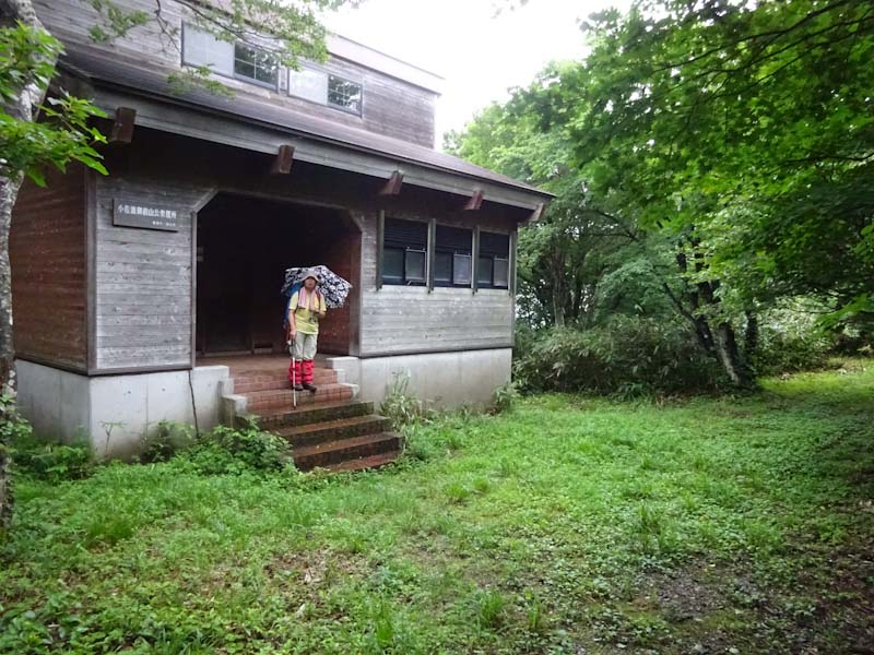 傘を差して歩いたが、雨は降ったり止んだりで、山頂近くでは、遠くの山並みや富山市街地、そして富山湾も眺める事が出来た。2時間でと言っていたが、やっぱりオーバーしてしまった。 (でも、帰りはそれなりに・・・) そして、こんなお天気だから、小佐波御前小屋にお邪魔した。