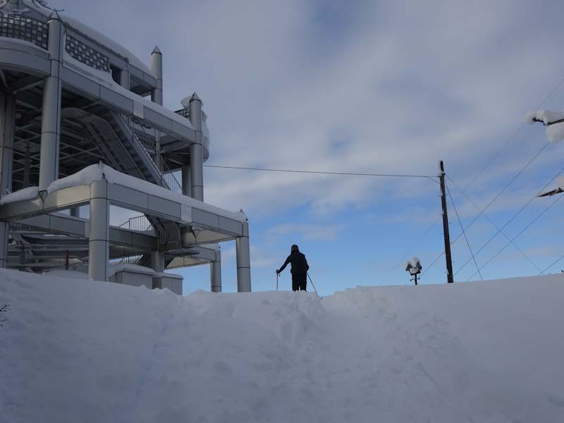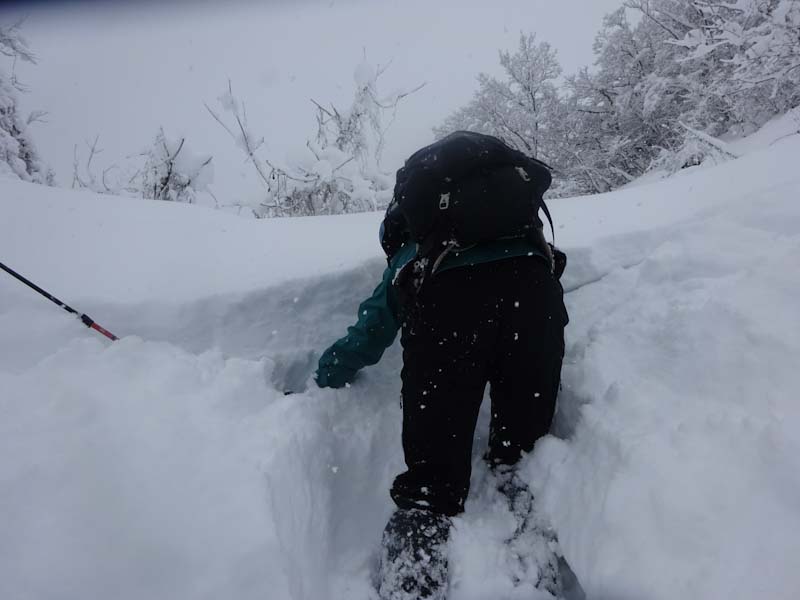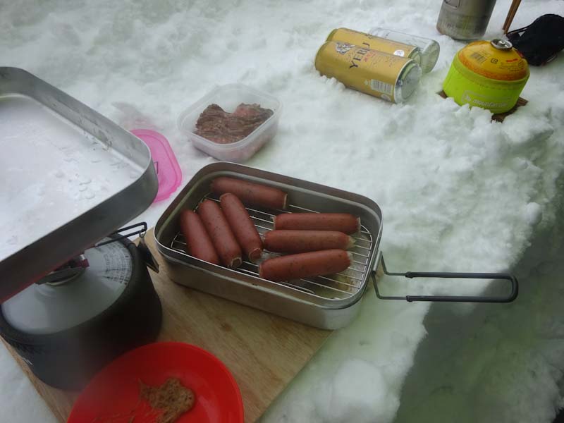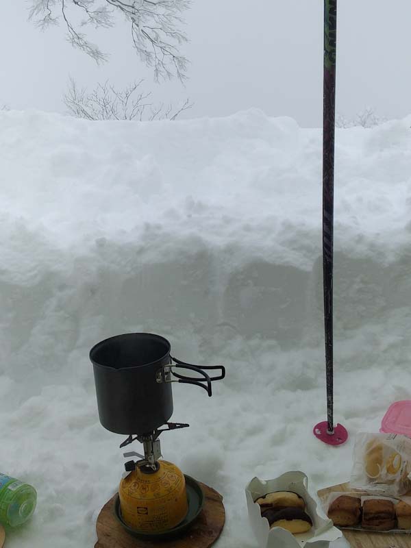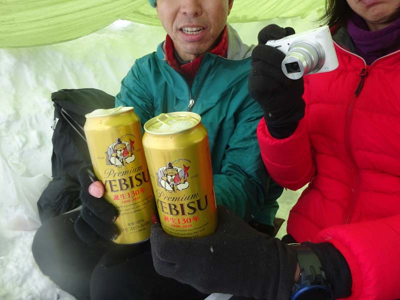 ずっと以前と比べれば、そうでもないかもしれないが、最近の雪事情から察すれば雪量あった。覗きもしなかったが、避難小屋はいっぱいだろうし、密を避けるためにも(本当はそうでもない。) 記念碑の前で穴を掘り、タープを張って食事とした。美味しい物をたくさん頂いた。もうお腹がいっぱいであった。
