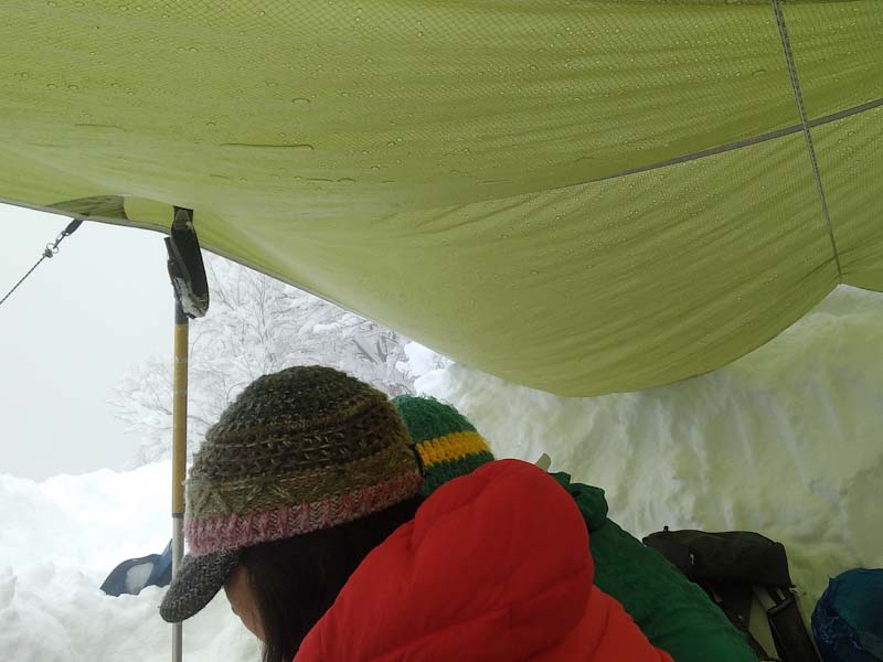 雪量が足らなく歪なタープ張りになったけど、山の話を中心に暖かい話が出来ました。