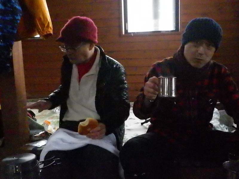 | 小佐波御前小屋に到着。 | アルコールがなくても楽しく過ごした。 |