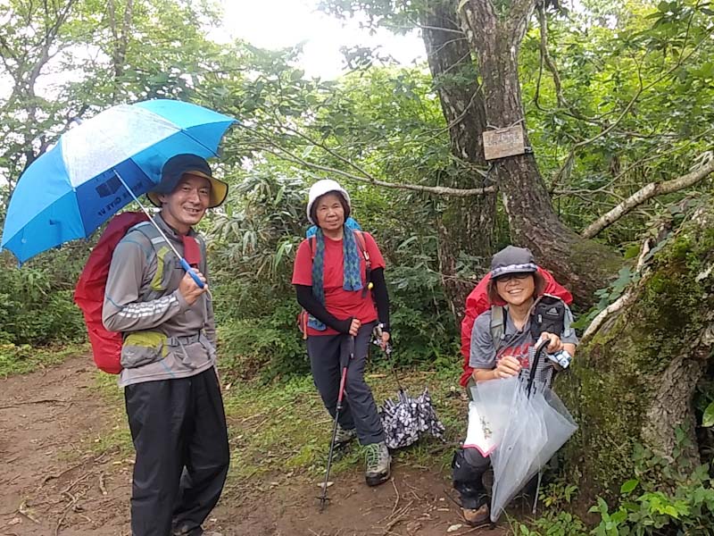 7/4 大雨予報だったので、歩きやすくて歩き慣れている小佐波御前山とした。しかし、降らなかった。時々傘を差したりはしたが、大降りとはならないどころか、傘を閉じたりした事もあった。そして、蒸したのだろうか、汗が滴り落ちた。