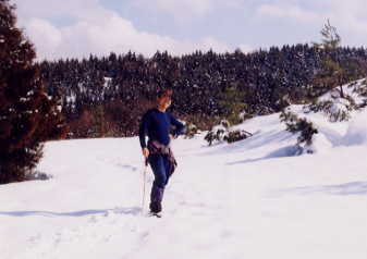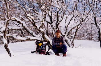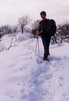 | 山頂から下り吹き晒した稜線が、何となく低山でも感じの良い所で、思わず立ち止まって、セルフタイマーでカメラに納まった。何度来ても、その時その時で雰囲気が違い、山の奥深さを感じるものである。 |