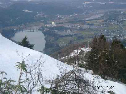| 猿倉の頂上に至る階段には、雪が吹き付けてか、事の他積雪があった。神通川のダム湖を眺めながら、富山平野にも、おのずと眼が行くが、どうにか「剱岳」が拝めないかと角度を変えては見たが、今日は、どうも機嫌が悪くどうしようもなかった。神通川対岸の反射板のある「笹津山」は、手の届く所に合ったが、何時だったか、雪の深い日に、山頂を極めた事を思い出した。 |