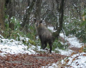 下山時に、カモシカと出会い頭の遭遇となる。私は動かなかった。何時もなら私がデジカメを首から方に掛けているのだが、その時だけ、「山ノ神」が持っていた。そーっとカメラをもらい、“動くなよカモちゃん!” などと、あやすように足を一歩前に出した途端に、ミゾレが降りだした。彼(彼女かもしれない)は、ビックリしたかのように走り出した。“オイオイ!” と叫んだら、具合よくまた止まってくれたが、周り中が暗くなってしまい、動く彼をきれいに撮る事が出来なかった。