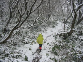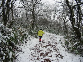 林道終点から、登山道(遊歩道)に入ると、もう白くなっている。標高600m付近から雪になっているようであった。チラチラと降る雪に、視界の悪さはそれほどでもなく、「獅子ヶ鼻」に行ってみる。41号線の車や
