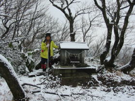 頂上付近の積雪は5cmくらい。高い山は真っ白。標高1000m以上の山では、かなりの降雪があったのではない事思われる。祠のある頂上で一枚パチリとやってから、石碑のある頂上へ行ってみた。
