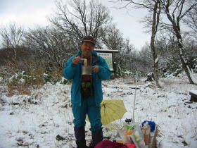 近くに立派な避難小屋があるのだが、風もないし、ベンチを利用して食事とした。途端に雪が降り出したが、それもまた良し。気温が低いから、なかなかお湯が沸かなかったが、傘をフードにしたらすぐ湧き、スープやラーメンそしてコーヒーを嗜んだ。こんなに寒くてもビールが欲しかったなどと、またも「山ノ神」の他愛ごと聞いてしまった。