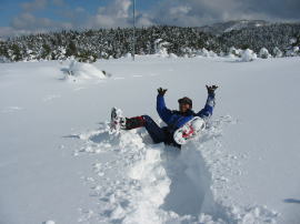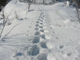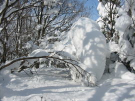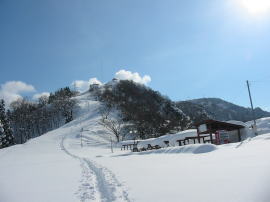 「山ノ神」は新年会で単独行。予想に反して、お天気となった。登り始めは、スキー場にも誰もいなかった。すぐカンジキを着けて歩き出すが、膝まで沈みなかなかペースが上がらない。45分後、前日のものであろうが、リフト終点からのトレースと合流しホッとする。(積雪70~80cm)真っ青な空と真っ白な雪の照り返しで目が痛い。サングラスは持参しなかったが、日焼け止めクリームを塗る。猿倉頂上に向かってまっすぐトレースに沿って歩き続ける。