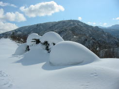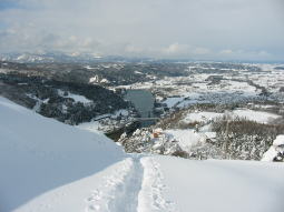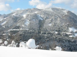 神通川を挟んだ対岸の笹津山(532m)。41号線を大沢野町に入ると、右手に迫ってくる反射板のある山である。笹津山から、南に大乗悟山・カンナ尾山・御鷹山へと続き、雪が締まった頃には、快適な尾根歩きが出来そうである。その先の、西新山や唐堀山までも地形図を見ている限り行けそうである。でも、私が笹津山に登った感想は、雪が降りしきる中で、杉だらけの山だった。しかし、私は未だ一度しか登った事がなく、いつの日か、その尾根歩きをしてみたいものだと、胸を膨らませている。