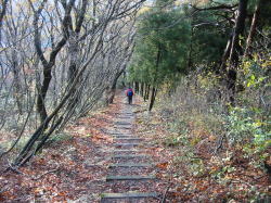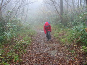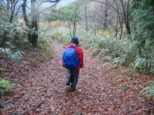 私は、晩秋特有の乾いた落ち葉の上を歩くのが好きである。しかし、今日は雨。仕方なしに濡れた落ち葉を踏む。でも、秋を感じる。一昨年の今頃は、深い雪の中を歩いていたのに、自然は同じ形で私達の前に現れない。そこが面白いところ。やがて、林道に出る。「雨のアスファルトの上を歩いて何が良いのか?」 声が聞こえそうである。何でもやってみなければ分からない。非日常の事から自然との出会いがあり、人生を変えるかもしれない・・・・・。