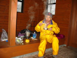 開通記念碑から1~2分の所に立派な小佐波御前山避難小屋がある。今冬ハレルヤでお世話になった所でもある。雨が降り続いていたし、食事をするのにお邪魔させてもらう事にした。入った途端に大降りの雨になり、助かった気持ちになった。一時的に強い雨だったようで、ラーメンを食べ終えた頃には、窓の外に青空が見え隠れするようになっていた。それにしても、立派な避難小屋で、皆で大事に使いたいものである。使用したお礼に、隙間から吹き込んだ落ち葉の清掃をして外に出た。気分がいい。