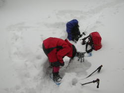 悪天予報に、ちょっぴり腐っていたのかもしれないが、「小佐波御前山」行きを決定した のが、午前7時半を過ぎていた。 そして、いろいろと手間取り、家を出たのが、午前8時50分頃であった。 もしかしたら、「北ちゃん」や真っ黒ネコさんらに、会えるかもしれないとの望みがあったが、 登り始めが、午前10時10分では、ちょっぴり無理であろうと思っていた。 昨夜来の降雪で、猿倉山を経由して御前山に達するに、1時間を要してしまった。 雪量が増えた後には、林道終点まで、15分余を要し、別ルートからの彼らに、 「もしかしたら、会えないかも・・・」のメールを打った。 小雪が舞い、時折横殴りの風雪に、「何で・・」 なんて思わない。 まるで、愛しい人に逢いに行くような気持ちである。 「もう、降りて来てしまうかもしれない。」 と携帯を手に取ったのであるが、 通じなかった。そして、山頂の祠を過ぎた、記念碑に行く前に出会ってしまった。 雪中の冷たさだけが感じる出会いは、何故か遠い昔の友と遭遇のように感じたが、 「小屋に、美味しいケーキを置いて来たよ!」 の一言で我に返った。 私の大事な「好山病・・」の仲間達である。 |