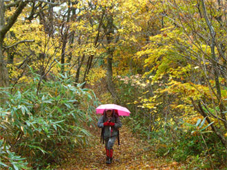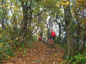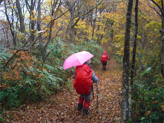 雨降る中、雨具を纏い展望レストランのある駐車場を経ったのが、午前7時20分頃であるから、小佐波御前山を目指すには、あまりにも早いスタートであった。お互いリックを見ながら、「これでは、太ってしまう。」 などの冗談が飛び出すほどであったが、「ゆっくり楽しんで行こう。」 と絨毯が敷かれたような落葉の登山道を歩きながら、久しぶりの会話を楽しんだ。