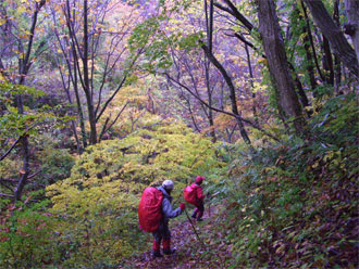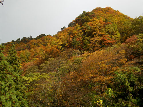 時間調整のため、開通記念碑のある山頂から、今生津方面に降りる事にした。このコースは、お天気が良くないに関わらず、メーンルートより紅葉が素晴らしく、大満足の散歩となった。その雰囲気に酔ったわけでもないが、地元の「まきちゃん」に、「もうすぐ、山頂。好山病5名が結集の予定。」 とよからぬメールを打ってしまった。