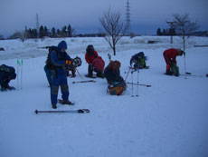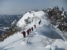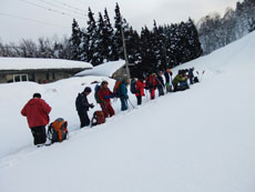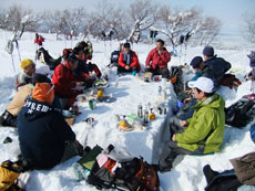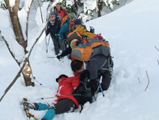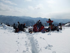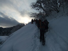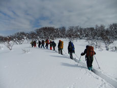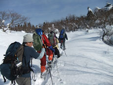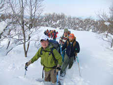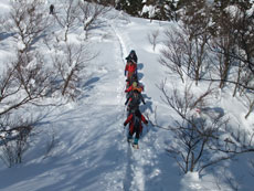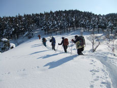 | 猿倉スキー場駐車場発 | スノーシューやカンジキを装着。 | ミニゲレンデ(チビッコゲレンデ)を行く。 |