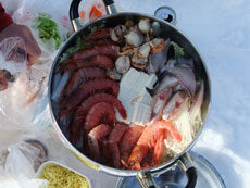 | テーブルは展望台で・・・ | 和やかな宴会模様。 | 堀シェフ特製の「寄せ鍋中華風」 |