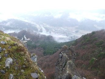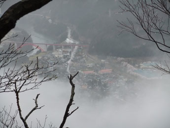 途中、ガスの切れ間から、楡原の街を覗き込む。