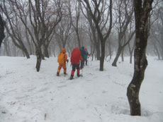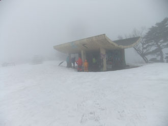 猿倉スキー場駐車場(8:30~55)=御前山(10:35~40)=祠のある頂上11:45=小佐波御前避難小屋(11:55~14:35)=御前山16:20=猿倉スキー場駐車場17:25