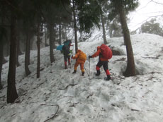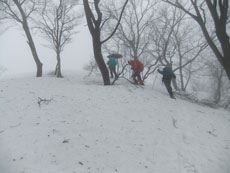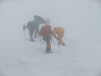 食事をしている内に予想通り雨が上がった。靄が掛かり視界が悪かったが、こうなれば好山病を代表する「北ちゃん」の真骨頂である。往路のルートから、わざわざ外れ、アスレチックといえばいいのか、クロスカントリーと言えばいいのか分からないような、斜面のトラバースやアップダウンを繰り返し、登りより降りの方が余計に時間が掛かるというおかしなルートを選択されてしまった。