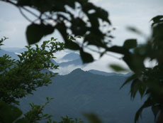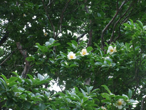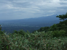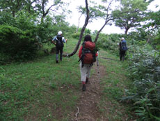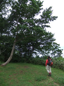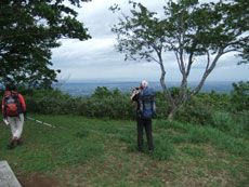 | なだらかな道になればもうすぐ山頂である | 雲海が広がれど、遠くの山並みが見えた。 | 開通記念碑がある山頂にナツツバキが・・ |