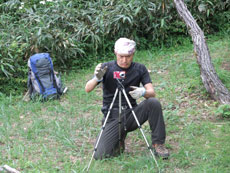 | 避難小屋から祠のある山頂へ。 | 雲海の上に、近郊の山々の頭だけが・・ | 「北ちゃん」の三脚で、記念写真を撮る。 |