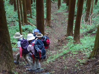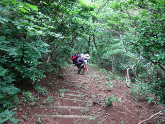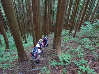 | 「また、降りるの?」 | 整備された杉林の中の階段を・・ |