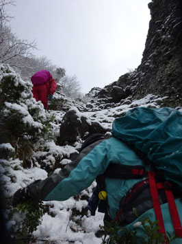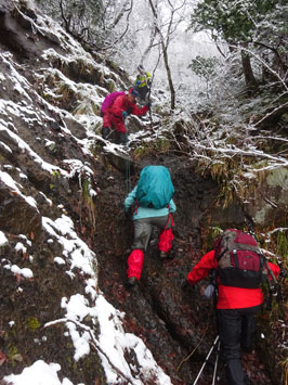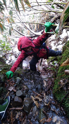 ますます沢が狭くなり急傾斜となる。| 何処を歩いているか分からない。 |