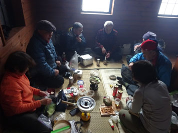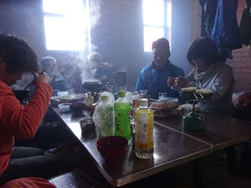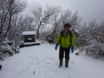 祠のある山頂で「北ちゃん」| ようやく、小佐波御前小屋に着きました。 |