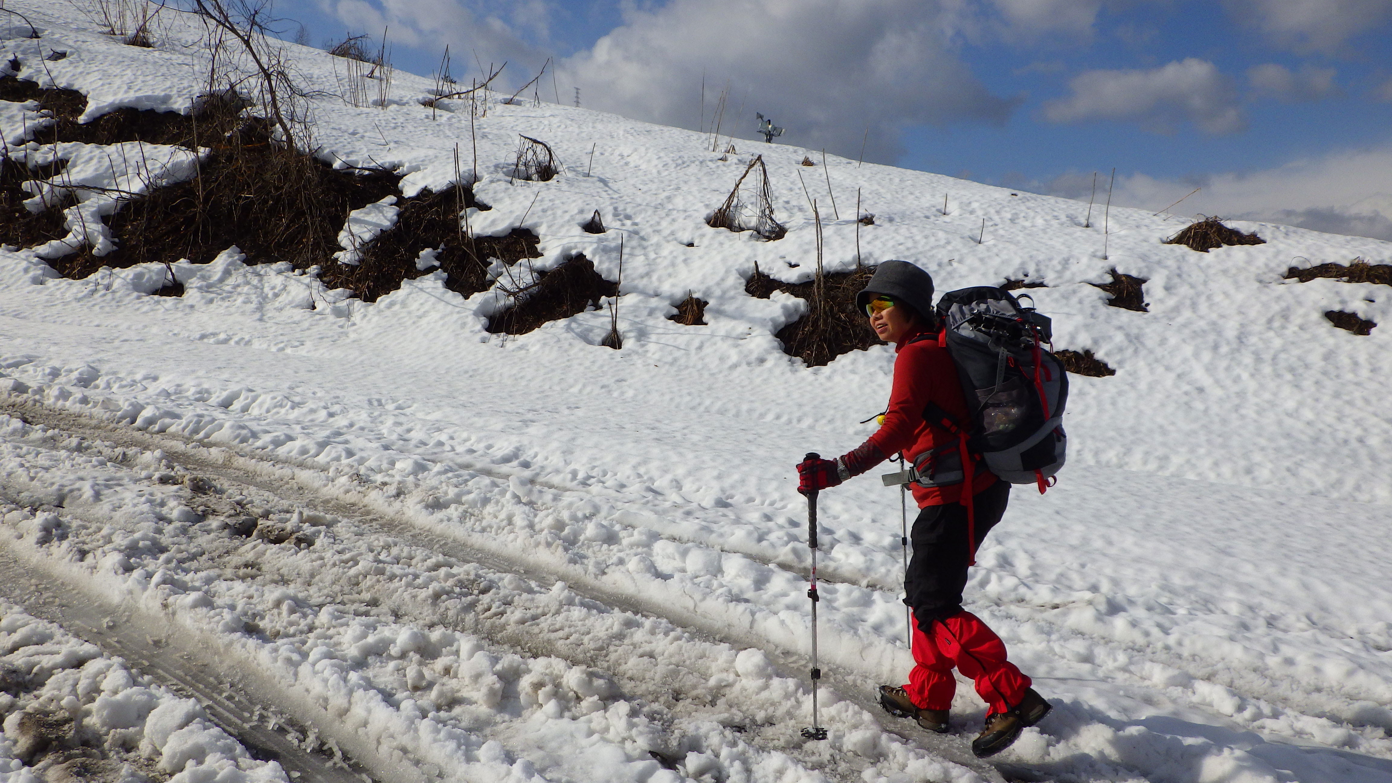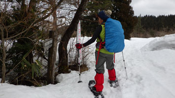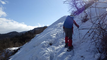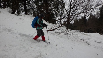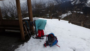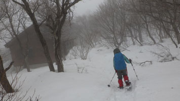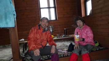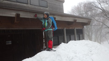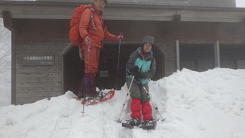 | 小佐波御前小屋に到着です。 | 屋根から落ちた雪上で・・ |