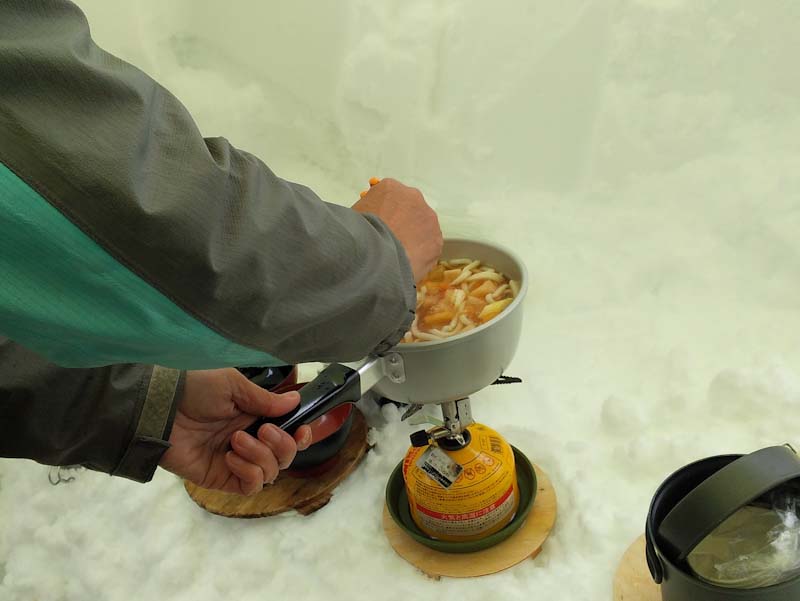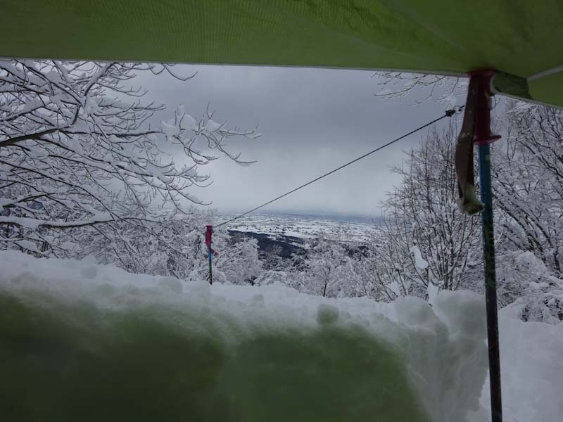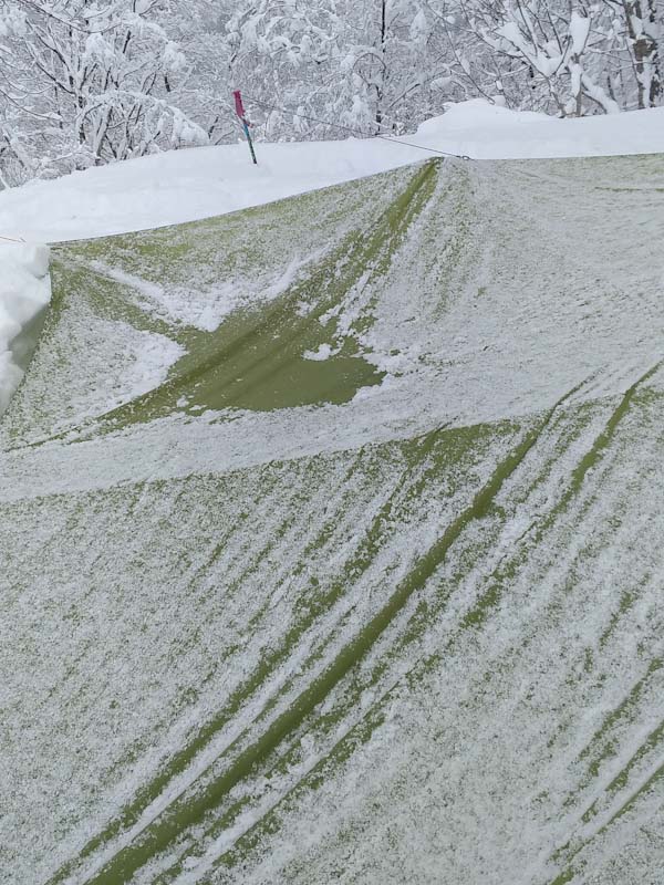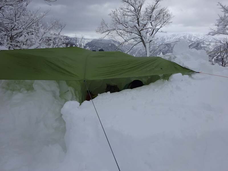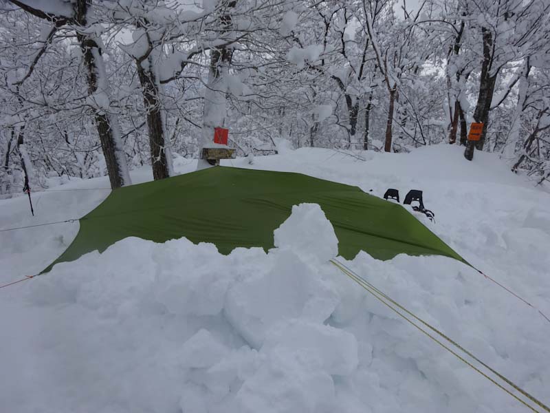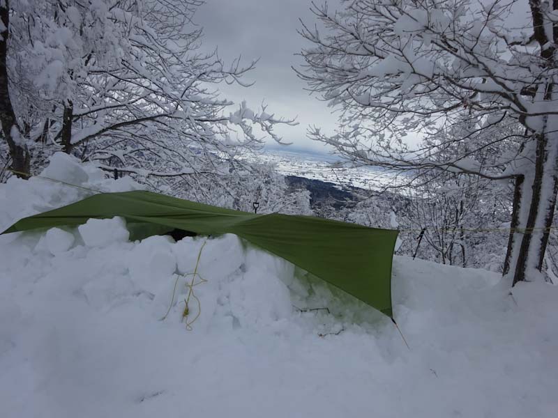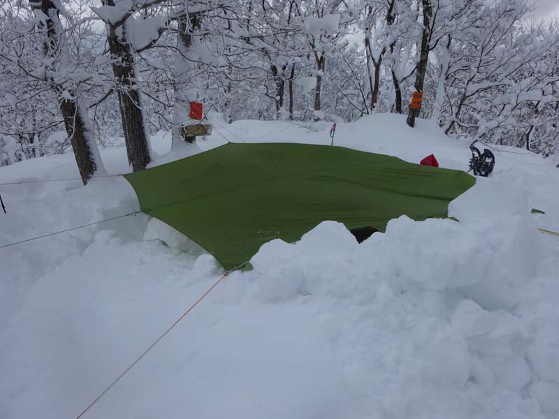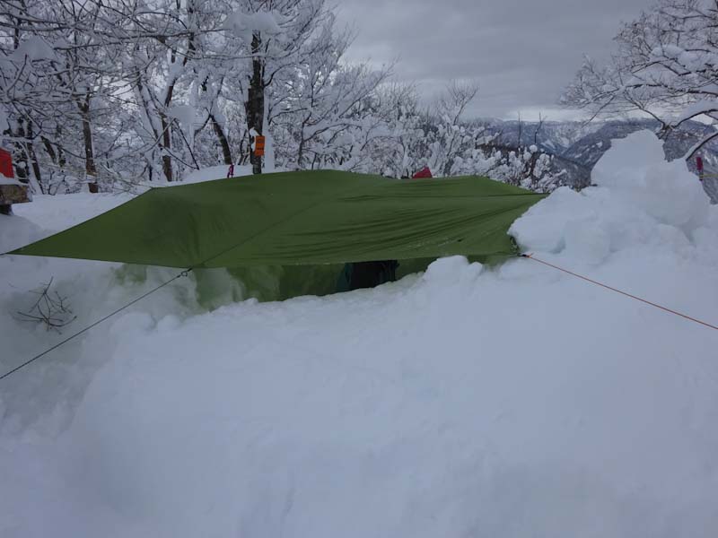 この時間だと大辻山はとてもじゃないけど無理。久しぶりに来拝山とした。トレースはバッチリで、誰もいない山は静かでステキである。(後から、ひとりが登って来られたけど) このところ、タープ張りが上手く出来なかったので、今日は地面が出るくらい穴を掘った。タープも決まった。