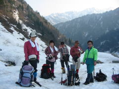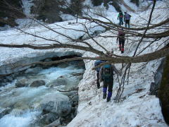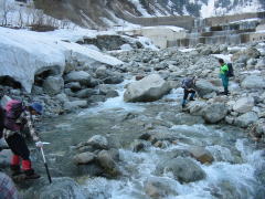 汚れた残雪の上を歩いたり、堰堤横の石垣を登ったりしながら、今山行の一番心配していた崩落しそうなスノーブリッジや渡渉をこなしてコット谷出合に到達した。