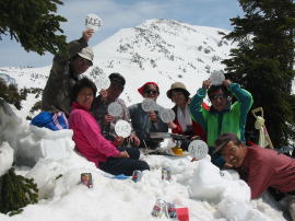 大日岳を背に、弥陀ヶ原~室堂の雪原の上に薬師岳や鍬崎山を眺めながら、雪中から冷やされたビールを掘り出し祝杯をあげた。筏井さんの羊鍋を始め、いろいろな肴に何時ものように盛り上がった。誰が担ぎ上げたのかわからないくらいのビール・ワイン・日本酒・焼酎、そして誰が飲んだのかわからないのになくなってしまう。不思議な仲間達である。そして飲まなく何時も運転を任せられる『天使』のお陰で我々は雲上の宴が楽しまれるのである。