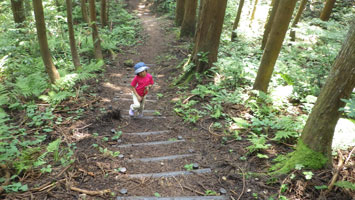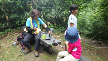 山頂まで13分、山頂で7分、ベンチに戻るまで10分。皆待っていてくれた。(私は荷を担いだままだったので、何もかもがびっしょりとなった。) 30分も休憩していたからであろうか、子供達は元気を取り戻した感じで、下山となると、いつもの通り心配をよそに駆けて行ってしまったのである。今日も失敗をした。千石城山で再び山に登る事にしたのであるが、エリーの靴(トレッキングシューズ)がない。嘉例沢を発つ時確認をせず忘れて来たらしい。弱った!