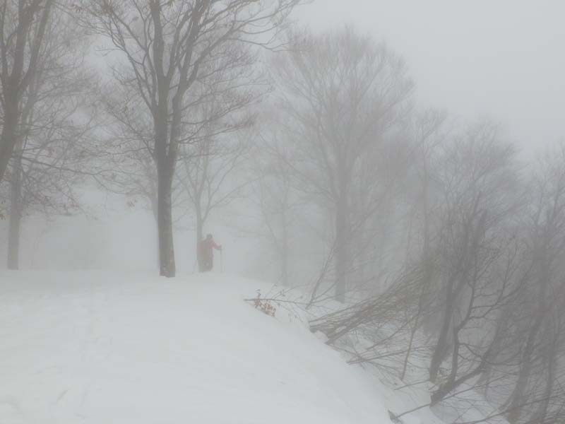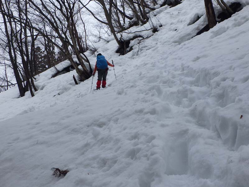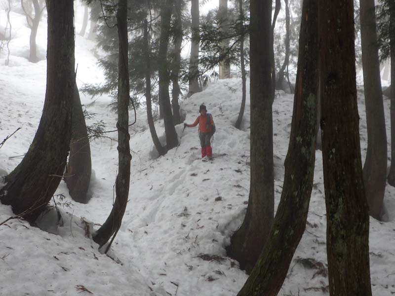 同女史は、何か用事があるという事で早々に立ち去られた。でもお会い出来て嬉しかった。登って来た所を降るのはイヤだという「山ノ神」に夏道を辿る事にした。しかし、どれもこれも、稜線から降りたもので、夏道はノントーレス。大した事はないだろうと進んだが、ちょっぴりルートから外れてしまった。