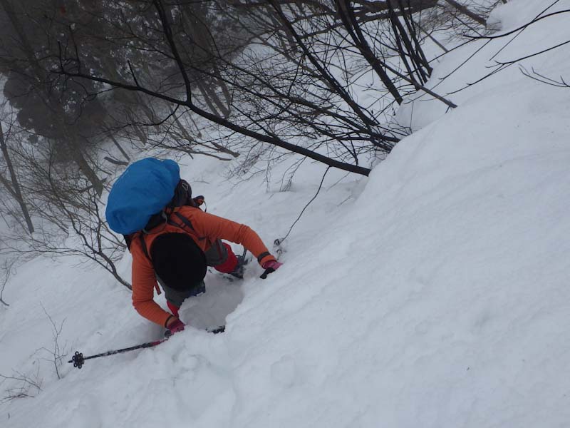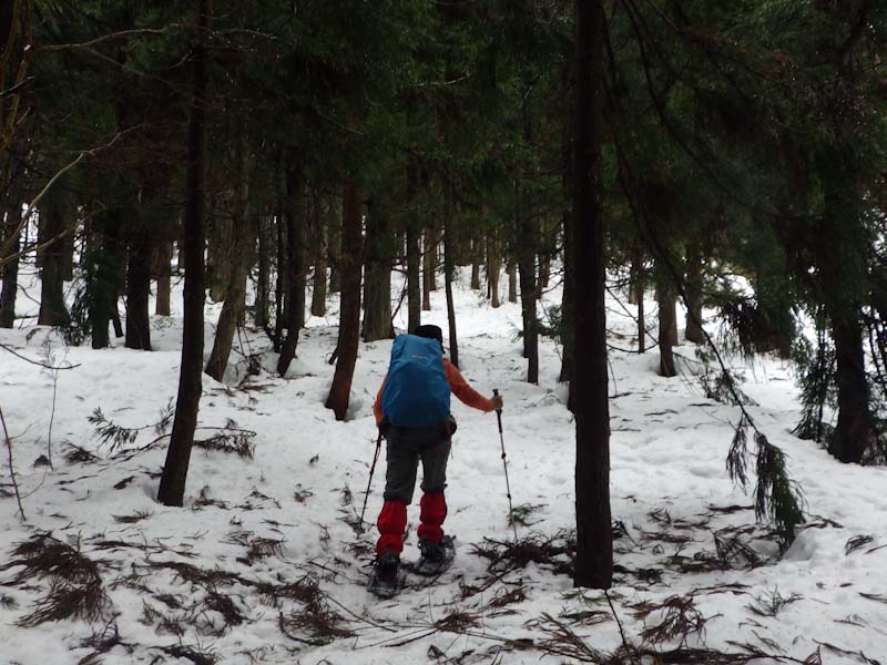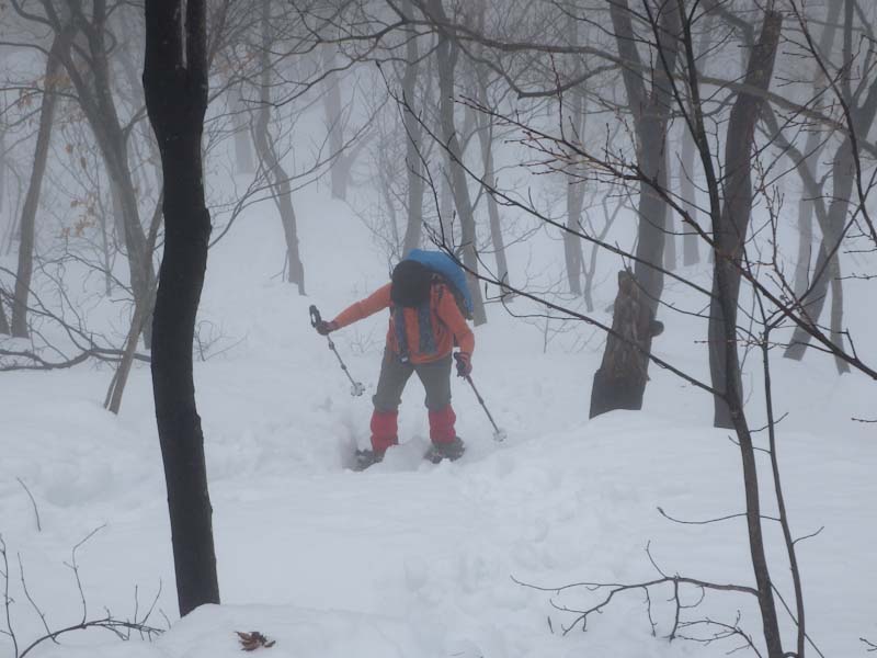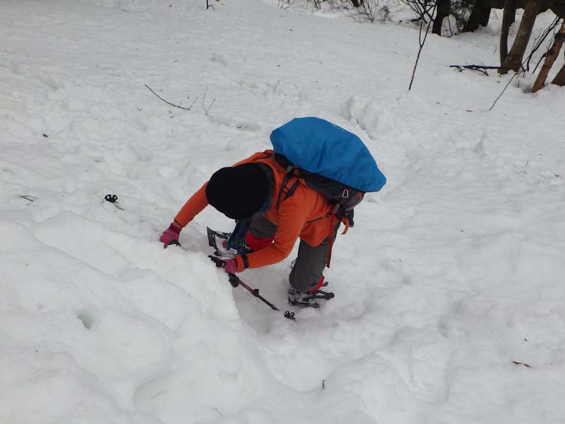 腰まで沈み底の木々にはまり込んでしまったのである。そうなれば、こちらもスノーシューを外して、シャベルの出番となった。後続者(最後の人)は複数でと、いつも言っているのは間違いない。さっさと行かれてしまっていたら、どうにもこうにもいかないのであるから。