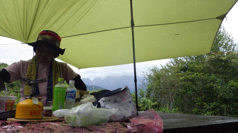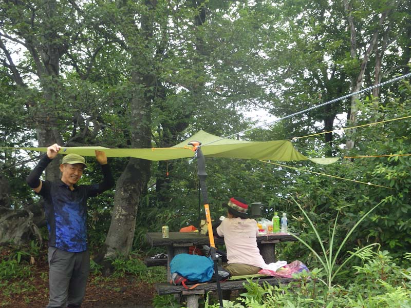 そして、大粒ではなかったが、山頂は雨になった。今日は、タープを準備していた。しかし、小道具不足から歪(いびつ)さは否定出来ないが、それでも小屋よりは山の情緒があり、久し振りに満足感に浸ったつもり。