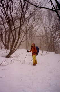 50~60センチの積雪の中、よたよたと壷足で40分掛けて無雪期の登山口に着く。擬似木の階段も見えぬ杉林の中へ、カンジキを着けて登行。
