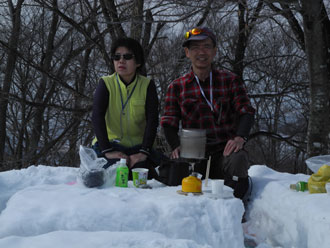 | ガスが晴れるのを期待しながら、千石城山々頂で・・・ |