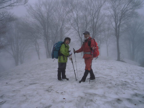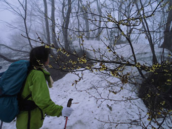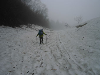 分かっていたとは言え、我が家から登山口の剱親公園まで、ずっと雨。歩き始めても霧雨という状態であった。今日は、「山に親しむ」 が、テーマ?だけに、長くて遠い林道歩きを選択した。「フキノトウでも・・」 との淡い思いがあったが、林道は、かなりの雪量に覆われていて、そのような雰囲気ではなかった。